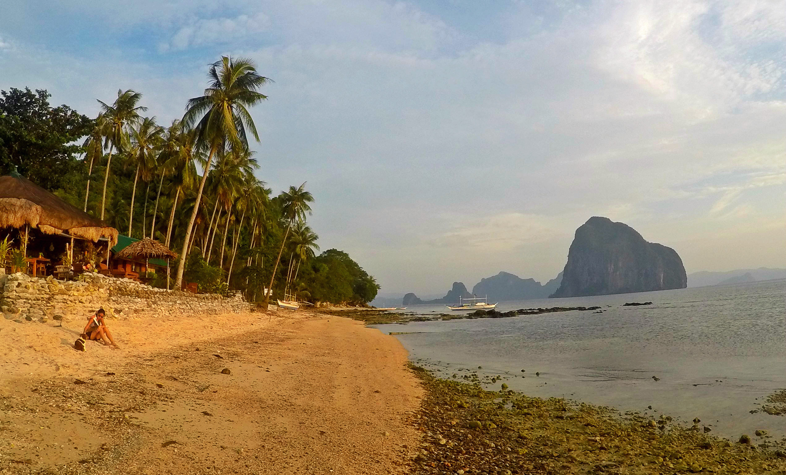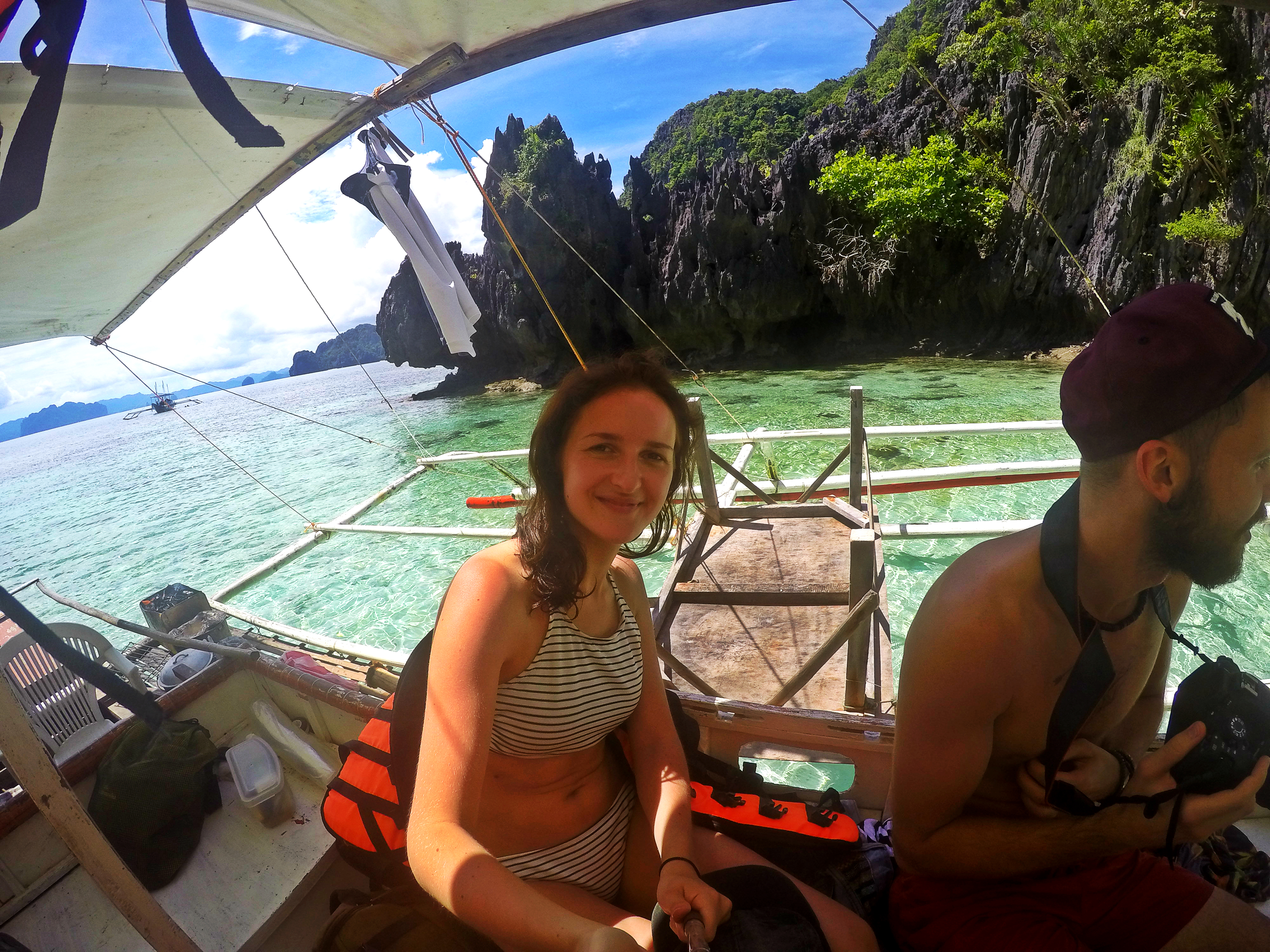 El Nido, nepaprasto grožio miestas Palawan saloje, pasiekiamas 8 valandų kelione autobusu (ne pati patogiausia). Pasižymi nuostabiais paplūdimiais, švariu vandeniu, kokoso palmėmis, džiunglėmis, uolomis ir svaiginančiu jūriniu peizažu. Kažkada tai buvo tik žvejų kaimelis, tačiau dabar miestas pritaikytas turistams, tačiau nenuvalkiotas ir vis dar unikalus. Povandeninio pasaulio mylėtojai teigia, kad tai viena gražiausių vietų pasaulyje nardyti. El Nido mus tikrai sužavėjo savo gamta, nedidelėmis salelėmis ir povandininėmis grožybėmis. Gyvenome ant jūros kranto su vaizdu į nuostabų peizažą. Dienas leisdavome paplūdimiuose arba plaukiodami po vietines salas. Buvome užsisakę kombinuotą turą, kuriame netrūko aktyvaus laisvalaikio, taip pat poilsio ir maisto. Vietinė laivelio įgula puikiai atliko ir gido pareigas, pasakodami apie salos istoriją, povandeninį pasaulį ir slaptas El Nido vietas. Filipiniečiai labai draugiški žmonės, supratingi ir paslaugūs. lydimi vietinių filipiniečių aplankėme rojaus vertas vietas, gražiausius paplūdimius, mėgavomes kokoso riešutais ką tik nuskintais nuo medžių. Tai buvo pačios tikriausios ir geriausios atostogos! Išbandėme keletą pramogų, viena iš jų buvo zip line – kelionė lynų iš vienos salos į kitą. Aukščiausia vieta 60 metrų- puiki atrakcija norint apžvelgti salas iš viršaus. Taip pat plaukiojome kanojomis lagūnose tarp uolų, nardėme su žuvimis iš animacinio filmo “Nemo” , sutikome vandens gyvates, aplankėme apleistą vienuolyną negyvenamoje saloje, apsinuodijome maistu ir galiausiai prasidėjus audrai įstrigome viduryje vandenyno su neveikiančiu valties varikliu. Visa tai susidėjo į neapsakomą didelį nuotykį. Žemiau keletas nuotraukų iš El Nido.
